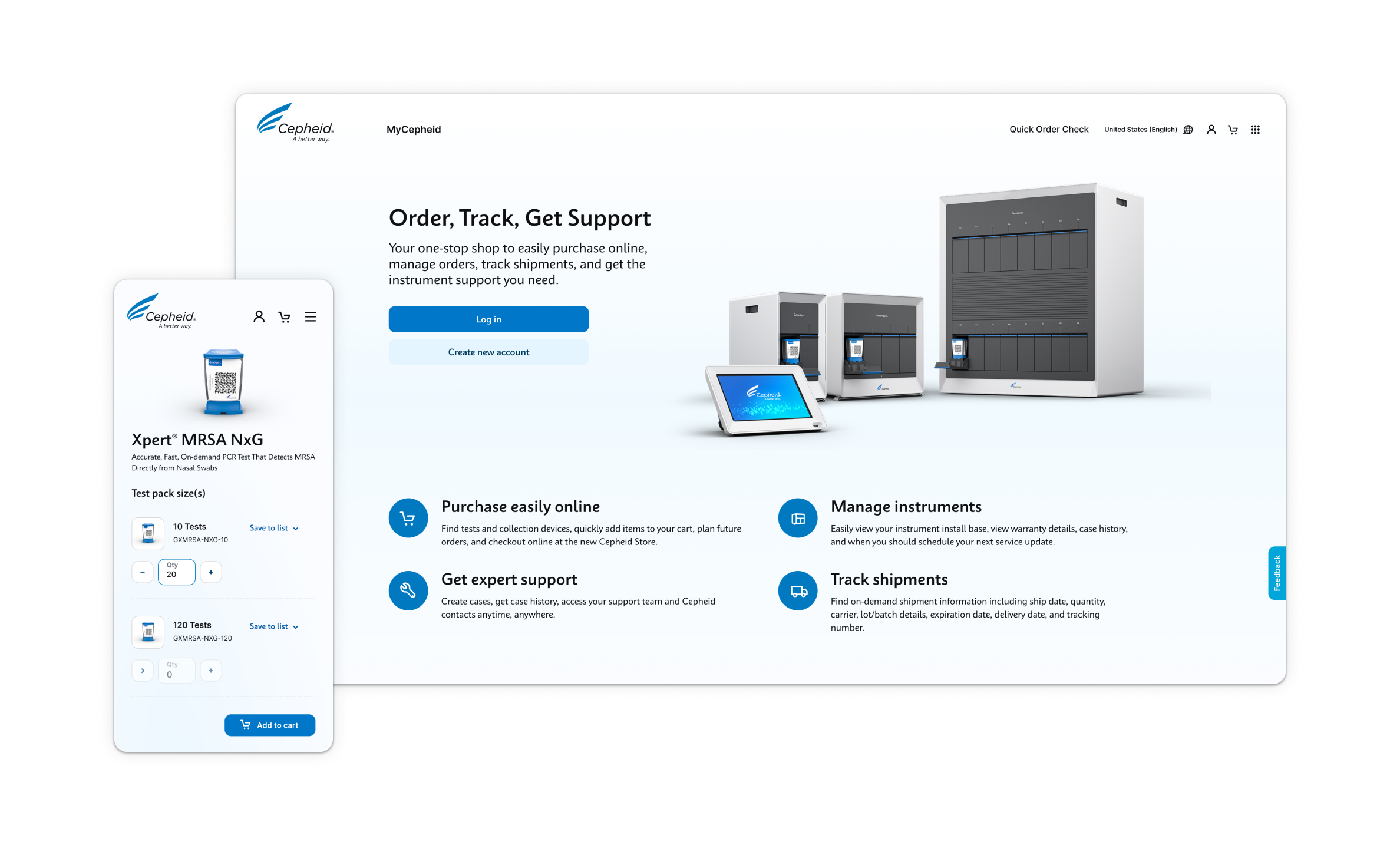 Today, the myCepheid portal offers customers a personalized dashboard where they can quickly access orders and shipment information, and view any open cases. It also features a buy again widget to make it easy to drop repeat purchases into their cart. In addition, they can set up notifications and manage orders as well as download invoices and proof of delivery. On the support side, customers can create cases and access Cepheid expert support as well as manage their instruments, view instrument details and service history, access warranty and service information, and get notifications before expiration dates.
