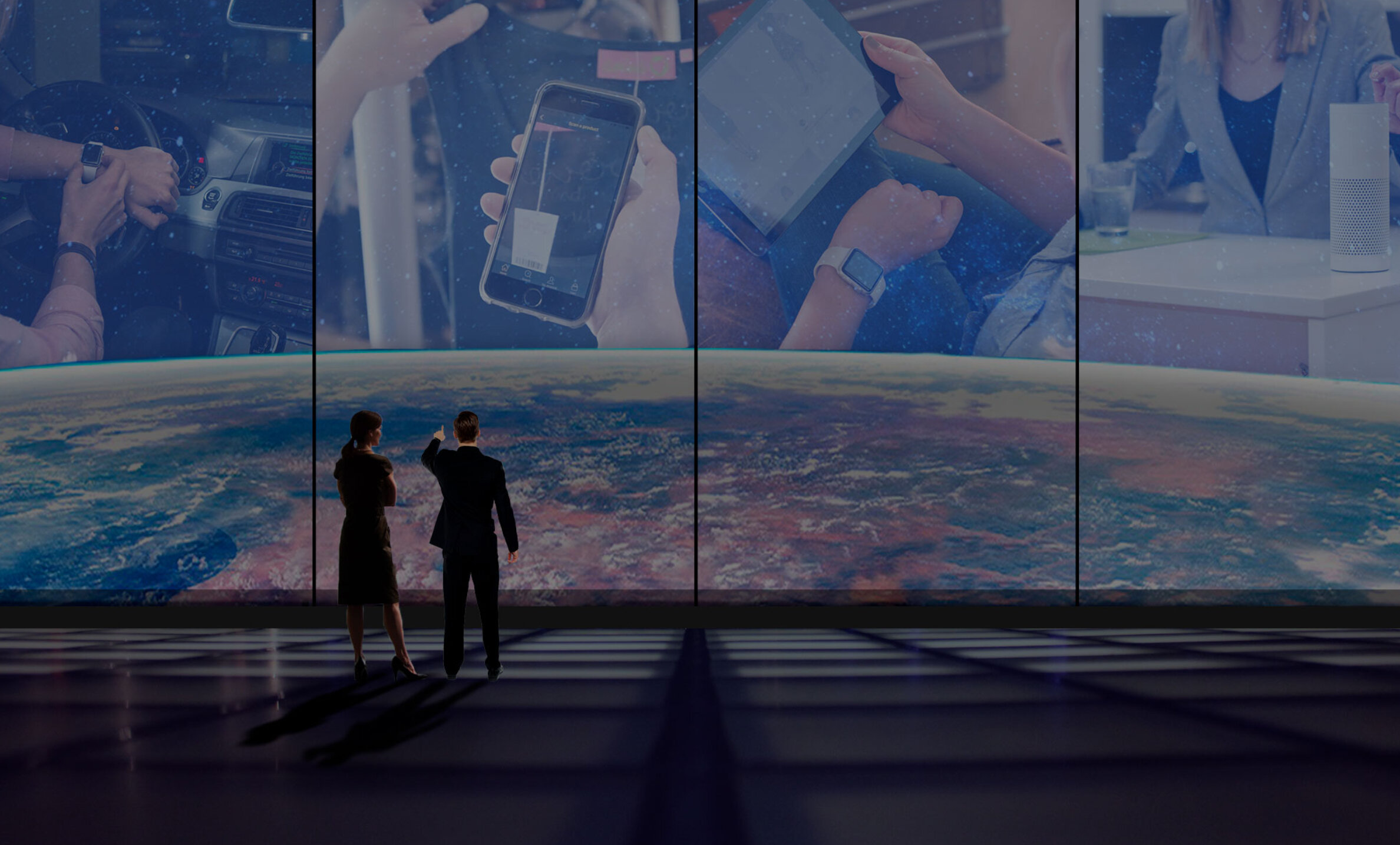 Woman with long hair wearing a gray sweater, using a digital tablet over a wooden table with a dark background and yellow hexagonal overlay.